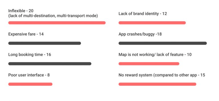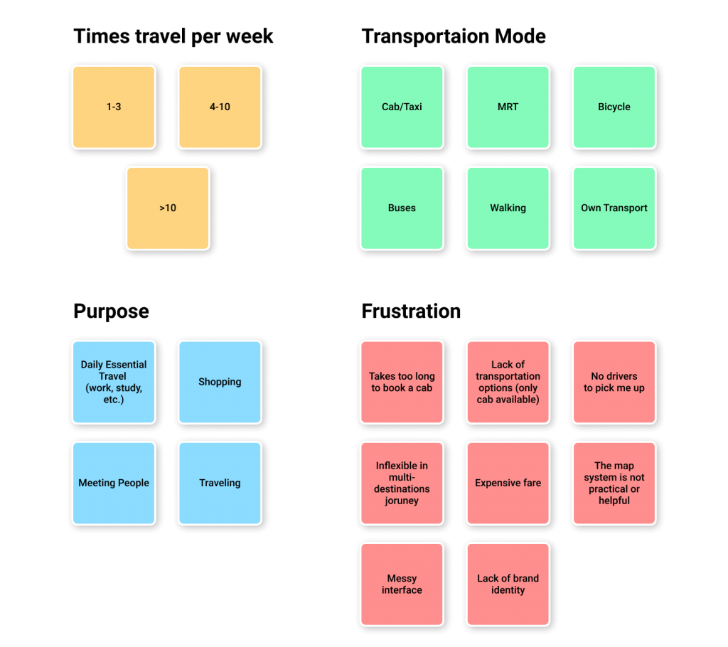After consolidating our result from our survey and some interviews we conducted with our friends, we found some of the top mutual frustrations that were shared amongst the users. (In red, shows the opportunity can be resolved with better UI and UX design.)