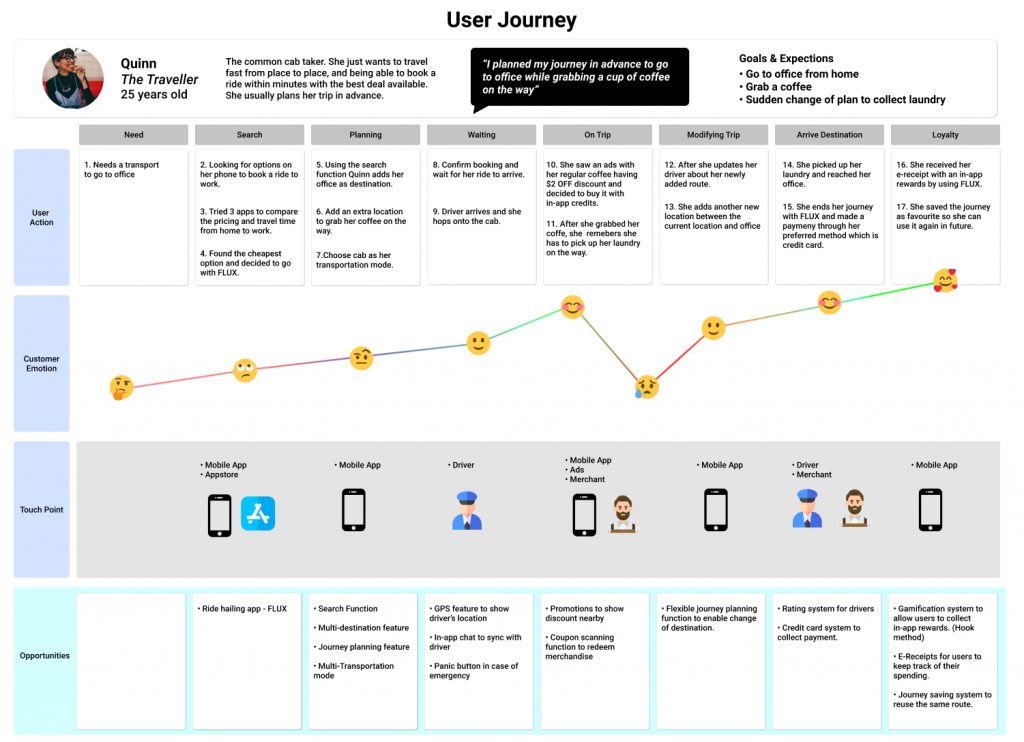 After having enough understanding of our targetted users, I start creating a user journey map to understand deeper into their struggle when using the app as well as, inserting some features we visualised that might works.