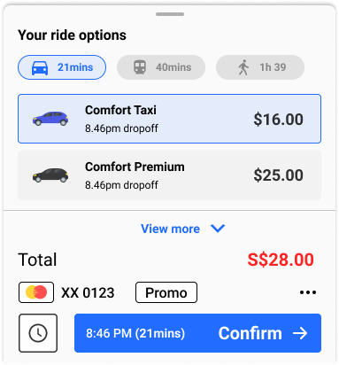 (The bottom drawer shows your ride options, drop off time, traveling time, price and preferred payment methods)